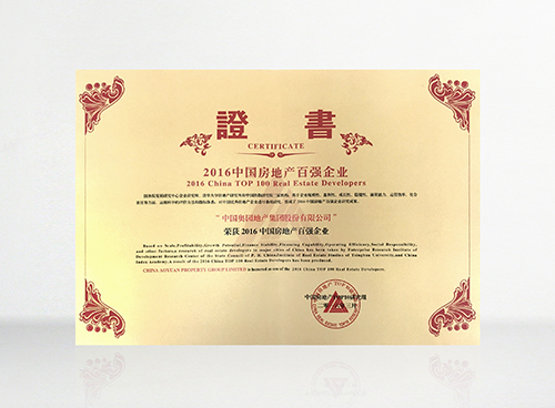 “2016中国房地产开发企业30强”第29名荣誉证书