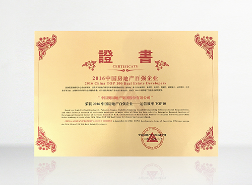 “2016中国房地产百强企业运营效率TOP10”第5名