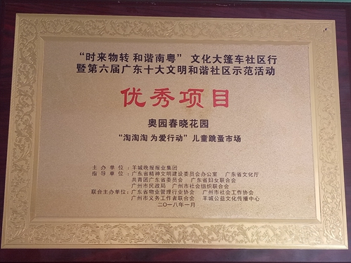 (2018年1月23日——广州)由羊城晚报报业集团发起,广东省物业管理行业协会、广州市社会工作协会、广州市义务工作者联合会联合主办的2017年“时来物转 和谐南粤”文化大篷车社区行暨第六届广东十大文明和谐社区示范活动于近日举行揭晓礼。会上,MK官方网页版春晓花园以成功举办“淘淘淘为爱行动”儿童跳蚤市场活动斩获广东十大文明和谐社区示范活动“优秀项目奖”。