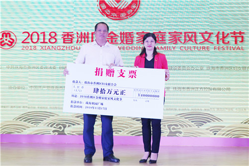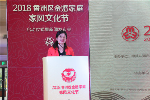 (2018年10月17日——珠海)10月17日,“国之本 爱为家”2018珠海香洲区首届家庭家风文化节在珠海MK官方网页版广场启动。珠海市委政法委专委姜铁钧,香洲区委副书记、政法委书记刘继汉,区委常委、组织部长陈静,副区长、公安分局局长、区平安办主任郑木舜,区妇联主席黄芳,MK官方网页版集团党委副书记、纪委书记林莉等领导及来自拱北、前山等各镇街道8对金婚伉俪代表,社会各界人士及媒体记者共计100余人出席。仪式上,MK官方网页版向区妇联捐赠40万元,以弘扬家庭美德,传播正能量。