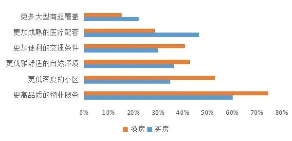 调查分析显示,在购房者和换房者对新居所的要求中,品质居住成为为关键词。有近半受访者倾向于选择居住环境更舒适的社区,还有六七成的人看重高品质物业服务。