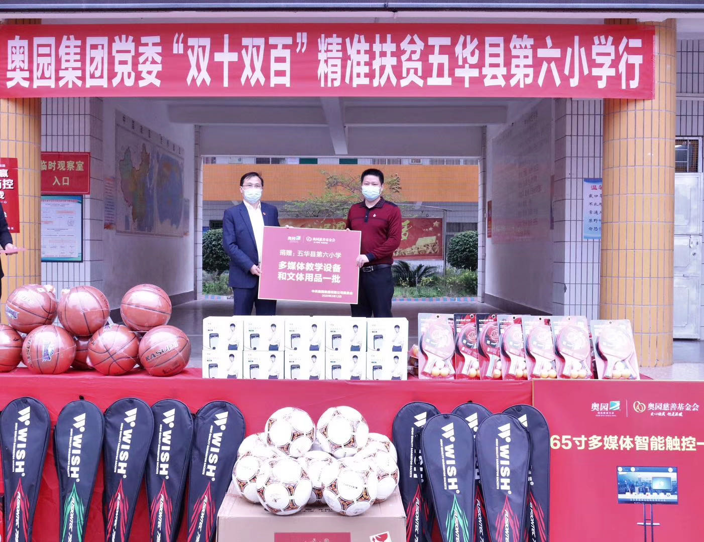 MK官方网页版集团党委,与五华县水寨镇坝美村、县第六小学开展结对帮扶。帮助村民改善周边生活环境,优先安排村民在MK官方网页版广场创业就业,积极帮助解决“两不愁三保障”问题,每年帮扶村里的贫困户,捐赠慰问金以及生活和防疫物资等。同时MK官方网页版集团党委携手京师MK官方网页版南奥实验学校,每年与五华县第六小学开展教育帮扶和教学交流活动,资助贫困学生,捐赠教学设备、文体用品等。