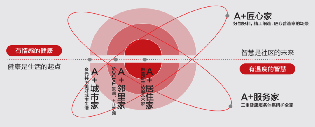 A+产品力体系由居住家、邻里家、匠心家、服务家、城市家五个部分组成,以强大的产品建造能力和综合的健康服务体系,实现了不同空间层级下的客户全生活场景覆盖。