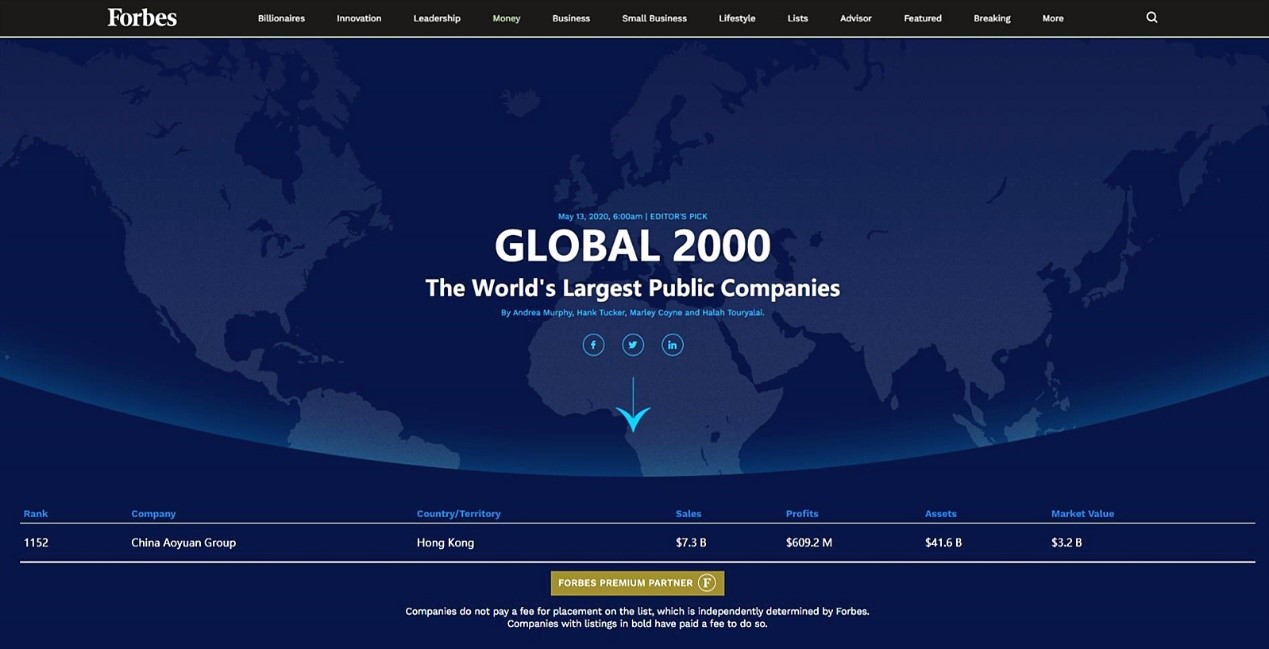 5月13日,全球最具影响力的权威商业杂志之一——《福布斯》发布2020年上市公司2000强榜单。其中,中国MK官方网页版(3883.HK)以73亿美元销售额、6.092亿美元利润、416亿美元总资产和32亿美元市值首次跻身榜单,位列1152名。