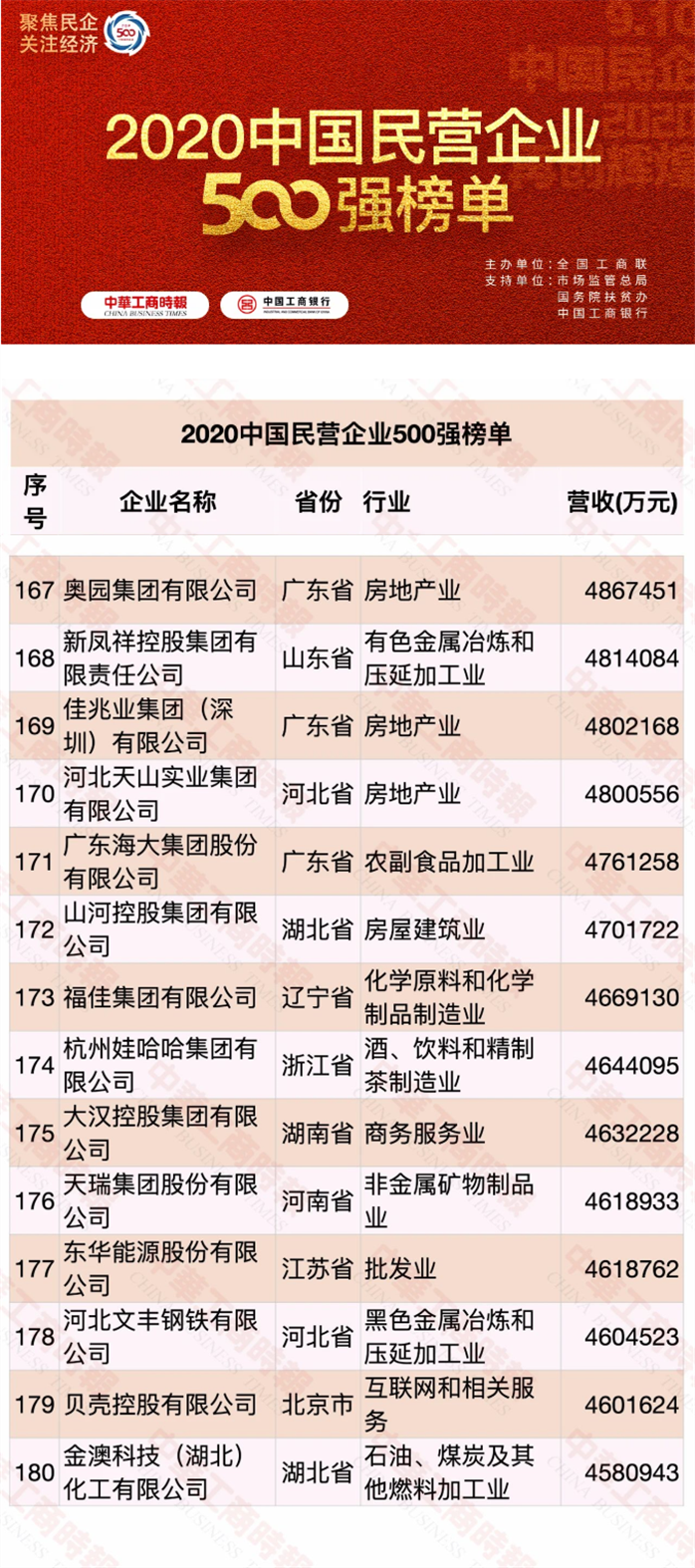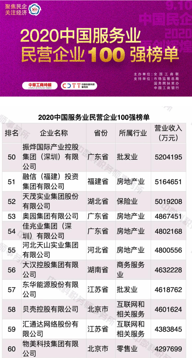 9月10日,由全国工商联主办的“2020中国民营企业500强峰会”在北京召开,同日2020年“中国民营企业500强”“中国民营企业服务业100强”榜单正式发布。