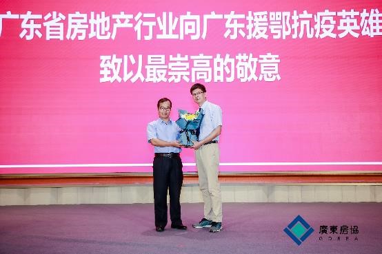 广东省房地产协会会长王韶(左)向广东省中医院援鄂医疗队员、芳村医院重症医学科副主任医师谢东平(右)献花