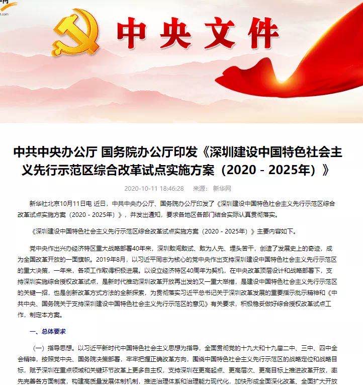 10月11日,中共中央办公厅、国务院办公厅印发了《深圳建设中国特色社会主义先行示范区综合改革试点实施方案(2020-2025年)》(下称《方案》),赋予深圳在重点领域和关键环节改革上更多自主权,有力推进深圳的改革开放事业。