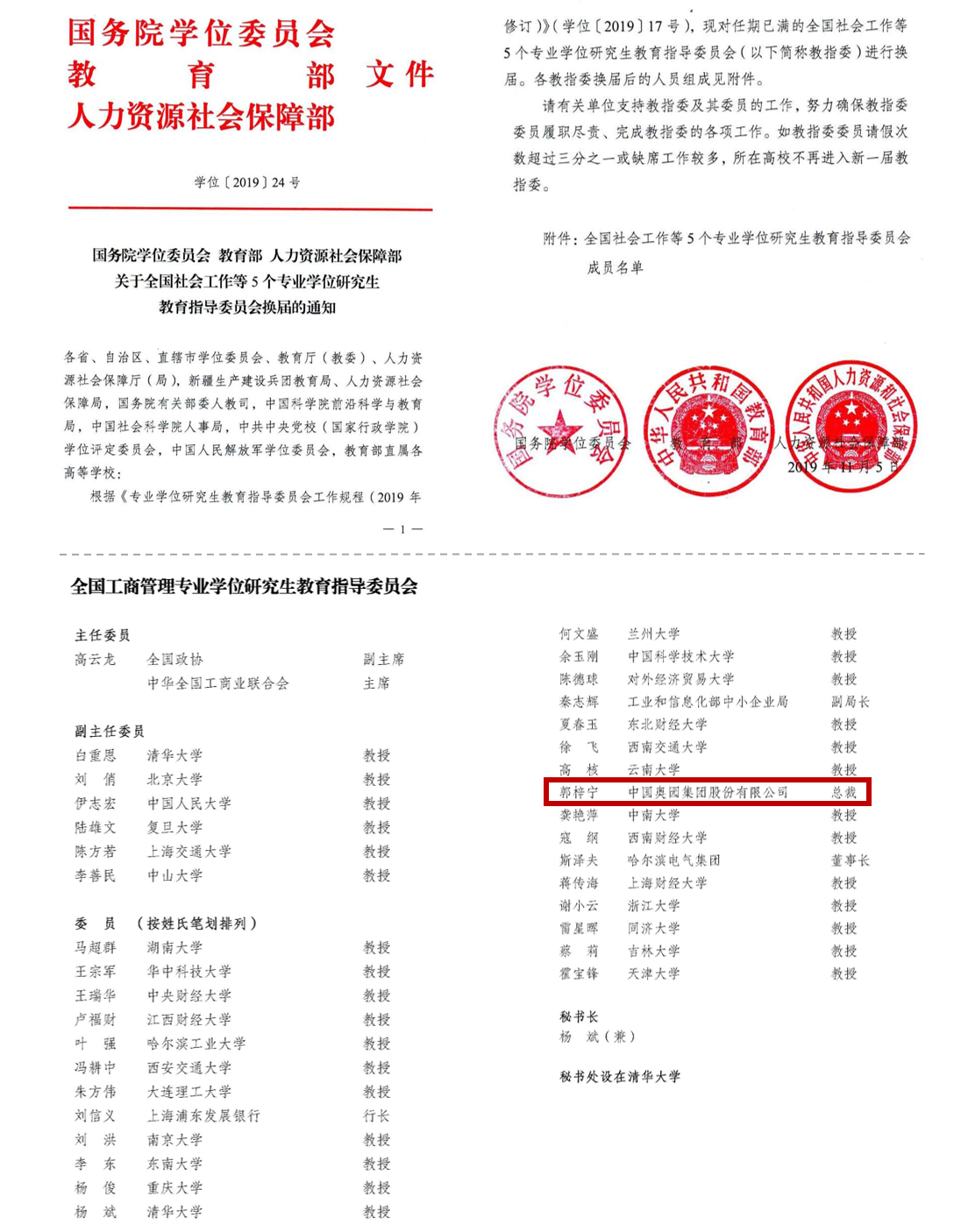 据国务院学位委员会、教育部、人力资源社会保障部2019年11月联合印发的《国务院学位委员会 教育部 人力资源社会保障部关于全国社会工作等5个专业学位研究生教育指导委员会换届的通知》(学位〔2019〕24号)显示,第六届全国MBA教指委有主任委员1人,由全国政协副主席、中华全国工商业联合会主席高云龙担任,副主任委员6人,委员28人。鉴于突出的学术成就与教育贡献,郭梓宁总裁被选聘为第六届全国MBA教指委委员,成为国内唯一上榜的民营企业家委员。