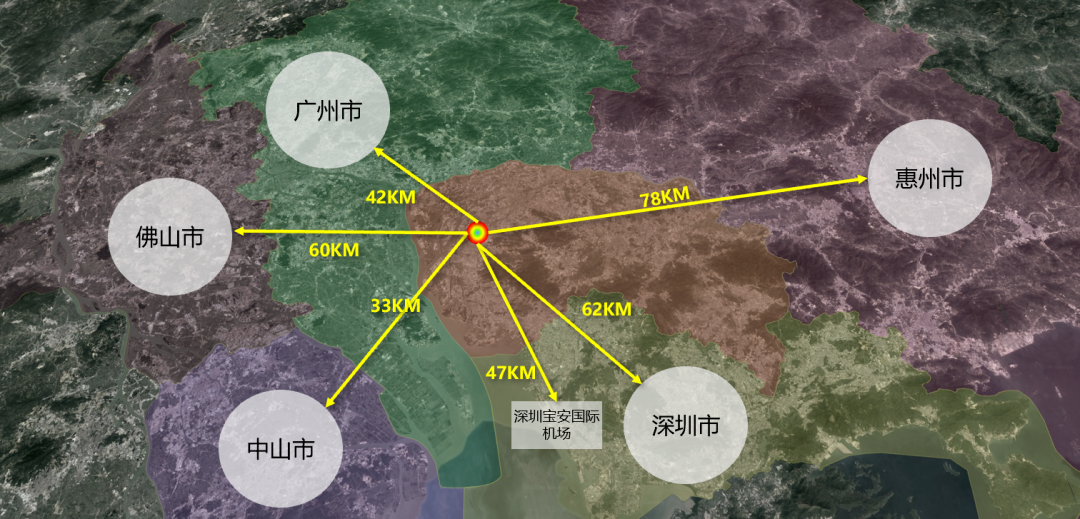 距离广州、深圳、佛山、中山、惠州城区均仅1小时左右车程,成为大湾区交通及产业资源的必经之地。
