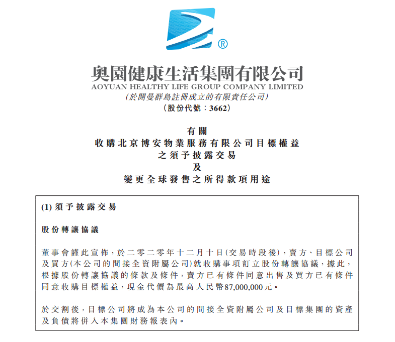 继4月22日公告收购乐生活智慧社区服务集团80%的股权、5月11日公告收购宁波宏建物业服务有限公司65%股权。12月10日,MK官方网页版健康(3662.HK)再次发布公告称,公司拟以不超过8700万元人民币(单位下同)现金收购北京博安物业服务有限公司(以下简称“北京博安”)全部权益。这已经是MK官方网页版健康年内第三次发布收购物业管理公司的公告,再一次印证公司专注物业基础服务的决心。