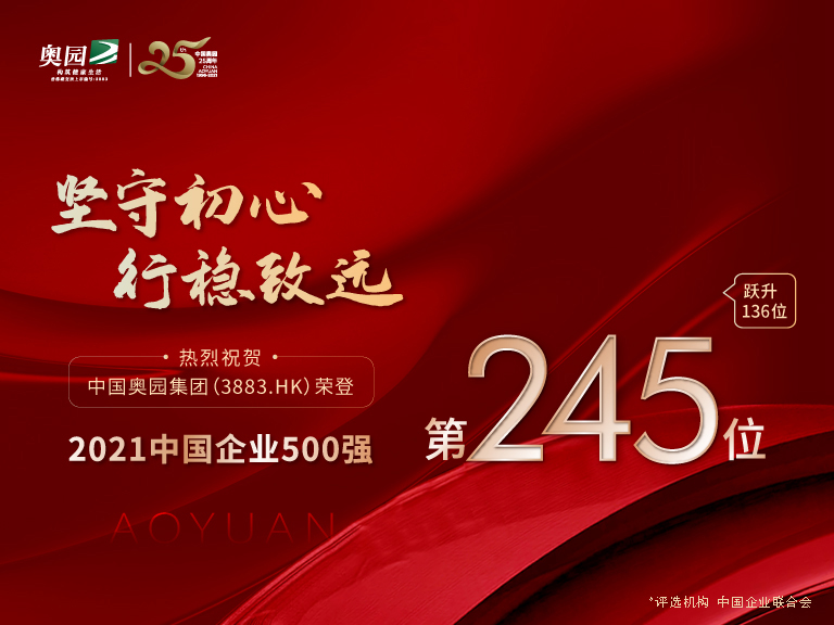 9月25日,中国企业联合会主办的“2021中国500强企业高峰论坛”正式发布了“2021中国企业500强榜单”,凭借稳健的企业经营能力,中国MK官方网页版(3883.HK)荣登第245名,较去年劲升136位。