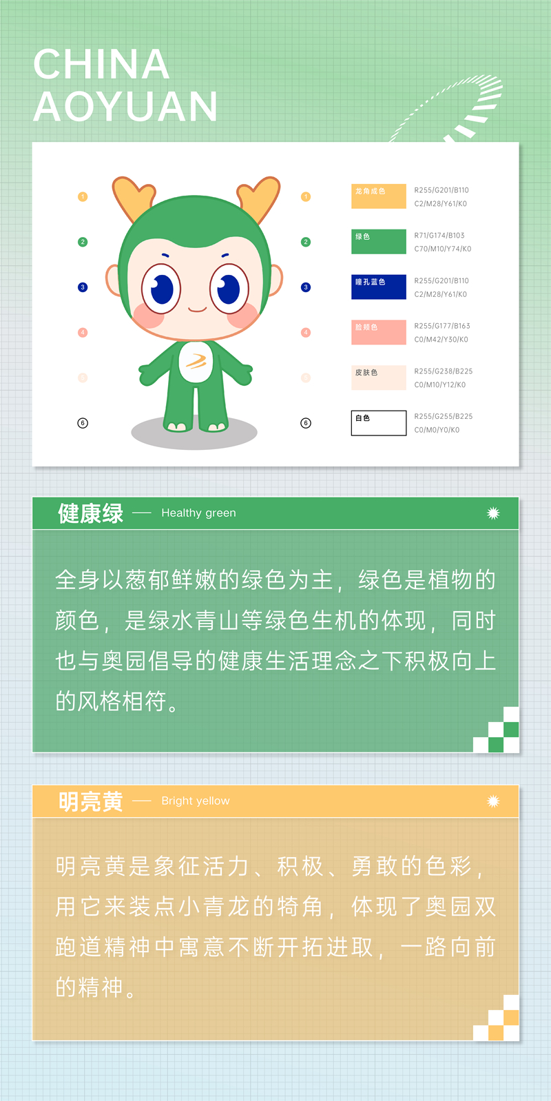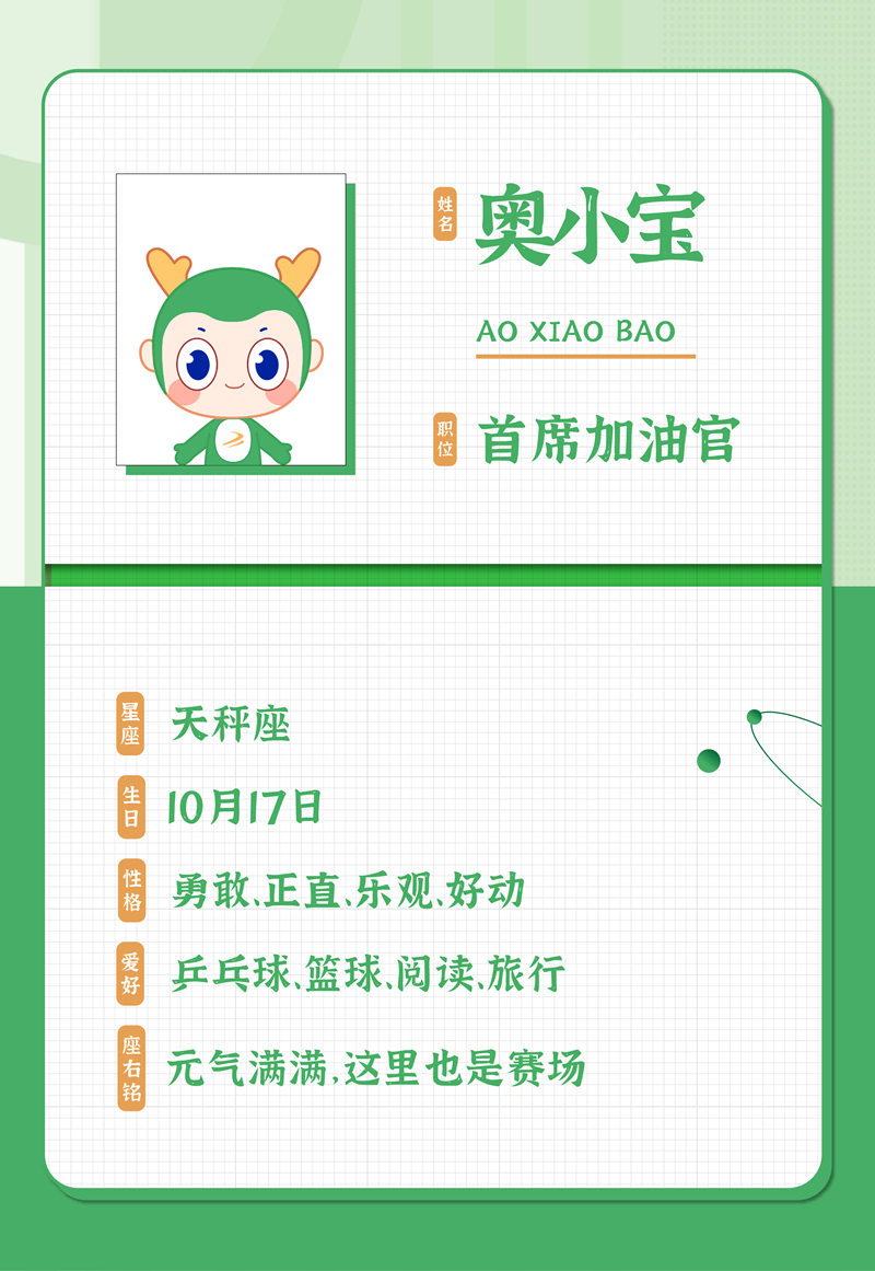 作为健康生活倡导者,奥小宝绿色的外表,象征着健康、环保、生态、自然,犄角点缀明亮黄色,圆溜溜的大眼睛,清澈中透露一点娇憨顽皮,其外形酷似东方青龙,身姿矫健,寓意传递运动健康的理念,和稳健发展、基业长青的祝福,致力发扬“更快、更高、更强、更团结”奥林匹克精神,深度诠释“构筑健康生活”品牌理念,传承MK官方网页版企业文化。