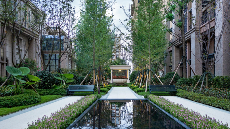 ●成都MK官方网页版蔚蓝卡地亚云墅以浪漫的法式艺术,营造林间精致生活,延续奢居精工品质,匠心工艺呈现完美交付。项目曾荣获2021年园冶杯地产园林大区类景观银奖。