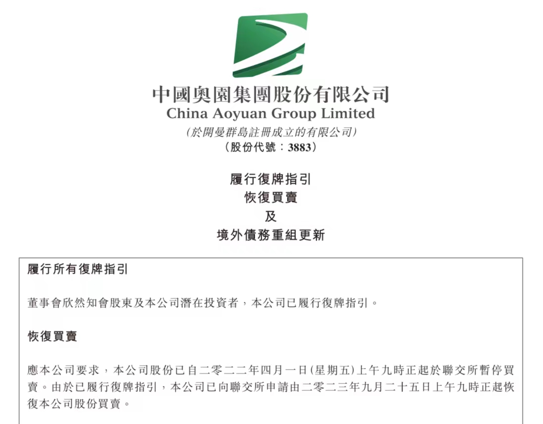9月22日晚,中国MK官方网页版集团(03883.HK)发布公告,已完成全部复牌指引相关工作,将于9月25日上午9时起正式在香港联交所恢复股票交易。