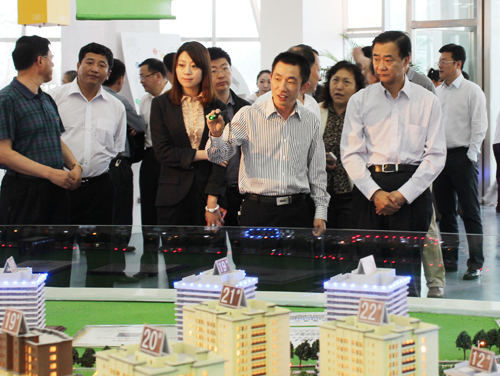 (2012年6月14日——沈阳)沈阳市市委副书记邢凯等市领导一行,在苏家屯区委书记邓福林、区长李宏德等区领导的陪同下,冒雨实地考察了沈阳MK官方网页版·会展广场商业综合体项目建设情况。