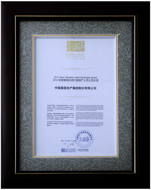 中国地产金砖由《21世纪经济报道》、21房地地产论坛组委会共同评选,组委会本着“客观求实、全面细致”的评审原则,遴选学界、金融界、专业机构专家组成强大的评审阵容,通过对众多权威机构的数据分析,项目现场实地调研、业主访问,媒体调查等手段评选出本年度的优秀企业。奖项旨在推动中国房地产业的国际化发展进程,展示房地产行业优秀成果,记录市场榜样,助力行业发展。