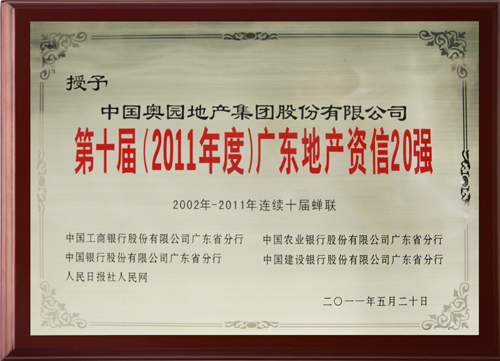 (2011年5月23日——广州)凭借良好的声誉和稳定健康的财务状况,中国MK官方网页版地产集团股份有限公司(「中国MK官方网页版」或「集团」;股份代号:3883.HK)荣获“第十届(2011年度)广东地产资信20强”称号,成为连续十年蝉联该项荣誉的四家大型广东省房地产企业之一。