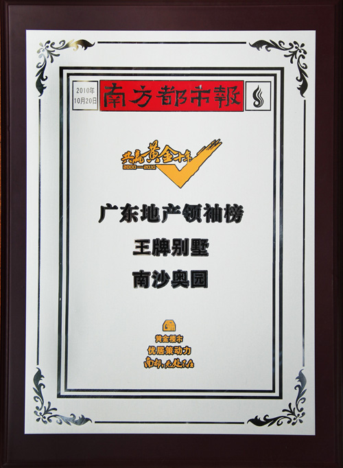 (2010年10月29日——广州)中国MK官方网页版地产集团(香港股份代号:3883)在由南方都市报主办的“优居策动力·共赢黄金十年”评选活动中脱颖而出,共揽三大奖项,集团荣膺“黄金十年·品牌房企”称号,董事局主席郭梓文先生荣膺获“黄金十年·领袖人物”称号,旗下南沙MK官方网页版荣膺 “黄金十年·王牌别墅”称号。