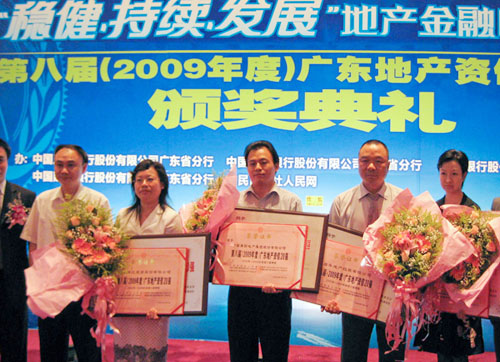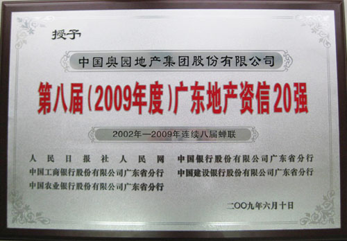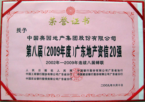 (2009年06月11日——广州)中国MK官方网页版地产集团股份有限公司(香港股票编号:3883)荣获由人民日报社人民网、中国银行股份有限公司广东省分行、中国工商银行股份有限公司广东省分行、中国建设银行股份有限公司广东省分行、中国农业银行股份有限公司广东省分行五大机构共同颁发的“第八届(2009年度)广东地产资信20强”称号,成为连续八年蝉联该项荣誉的四家大型房地产企业之一。