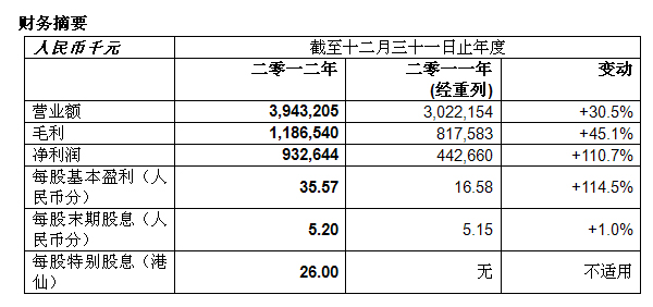 回顾年内,集团的营业额为人民币39.4亿元,较二零一一年增加30.5%。毛利增长45.1%至人民币11.9亿元,毛利率亦增加至30.1%。净利润达人民币9.3亿元,同比上升110.7%。每股基本盈利为人民币35.57分(二零一一年:人民币16.58分)。业绩表现卓越,董事局建议派发末期股息每股现金人民币5.20分(二零一一年:人民币5.15分),以及特别股息每股26.00港仙,此特别股息可选择以现金、新股份或以部份现金及部份新股份的方式收取。
