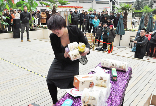 客户们参观完售楼中心并听取置业顾问对楼盘的讲解后,领取到参赛券,美女、辣妈们齐上阵,做着赛前的热身准备,随着一声令下,她们火速跑到对面的礼品区,争分夺秒的抢礼品,眼疾手快的美女、辣妈们出击就是稳准狠,几秒钟的时间里,选手们每个人抢到的礼品数量都颇为可观,赛场外亲友团的加油呐喊声也从未间断,现场气氛高涨。上午会展广场的比赛让美女们都意犹未尽,下午国际城的比赛精彩持续上演。活动在欢声笑语中结束,选手们都满载而归,此次活动受到了女性客户们的一致好评,也促进了当天的销售。