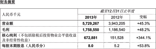 2013年,本公司成功取得优异的经营业绩,营业额为人民币57.29亿元,同比增加45.3%。毛利增长48.2%至人民币17.59亿元,毛利率亦增加至30.7%。净利润达人民币7.52亿元,而核心纯利(不包括除税后投资物业公平值收益及非经常性收益)约为人民币6.73亿元,较2012年大幅增长约344.1%。每股基本盈利为人民币27.42分。董事会拟派末期股息每股人民币8.0分。