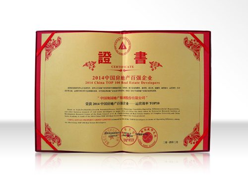 “2014中国房地产百强企业——运营效率TOP”证书