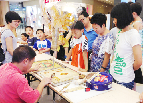 十个项目中,又数画糖画和米上刻字最受欢迎。糖画的糖料一般是在红、白糖中加上少许饴糖放在炉子上用温火熬制,熬到可以牵丝时即可以用来浇铸造型。在绘制造型时,由艺人用小汤勺舀起溶化的糖汁,在石板上飞快地来回浇铸,画出造型。负责制作糖画的林老师还是业内小有名气的专家,活动当天,广东电视台对林老师还进行了专门采访。我们平时吃的糖画都是2D平面造型,可是林老师有一项绝活——3D造型,草蜢、凤凰、花朵……只要你想得到的,林老师就可以做出来。“糖画载满我们儿时的回忆,今晚注定失眠了。”活动结束后,网友通过微博向MK官方网页版广场表达游园市集带给她的感动。