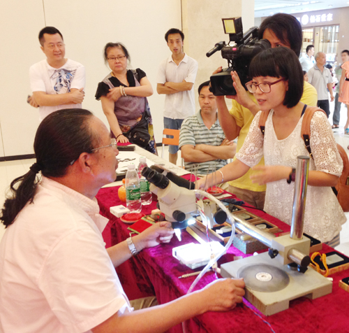 6月2日,著名书法家、篆刻家、微雕艺术家朱德祥亲临MK官方网页版广场,并现场展示了近期创作的微雕作品,微雕媒介有印章、寿山石、象牙、中国扇等,图案包括佛语心经、诗歌、山水画等等。如果不是现场观看,真的很难想象偌大一幅山水、人物画可以用纯手工雕刻在小小一块寿山石上,朱老师巧夺天工的作品令现场观众的赞不绝口。