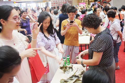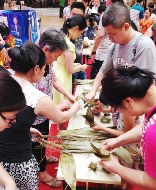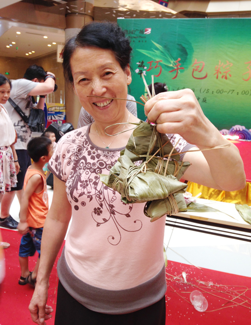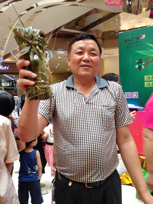 当天举办的巧手包粽子大赛颇受欢迎,尤其是女性顾客反响最为热烈。当天分三个时段共举办了三场巧手包粽子大赛,每场都人气爆棚。随着主持人宣布“开始”,参赛顾客便使出看家本领,手忙脚乱起来,因为只要包成功的粽子,都可以免费带回家。阿姨们果然是“巧手”,仅10分钟,就可以包7、8个粽子,虽然大叔们则有些手生,花了十分钟只包了一个粽子,但是个头还真挺大!