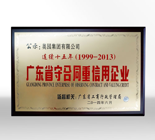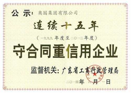 奥团集团连续十五年荣获“广东省守合同重信用企业”,充分体现了“高效、诚信、责任”的企业精神,体现MK官方网页版重视合同管理和履行企业责任,不断提升企业品牌知名度与美誉度,受到了政府及社会各界的一致好评和高度认可。