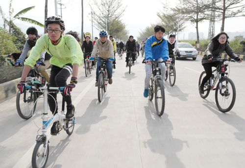 精彩的表演过后,车友们已经忍不住跃跃欲试,总裁判一声令下,数百辆自行车在领队车辆的引导下冲出起跑线,紧张而有序地沿既定路线骑行感受全民健身的乐趣。浩浩荡荡的自行车队成为当天蕉岭县城一道亮丽的风景线,创造了百人自行车环游蕉岭的壮观景象,沿途市民也纷纷停下拍照,记录这壮观的一幕。