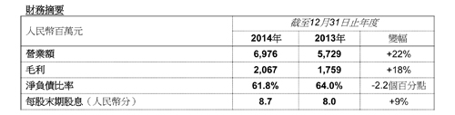 营业额增长22%至人民币70亿元,凈负债比率降至61.8%,有效去杠杆化