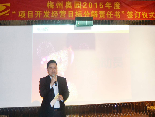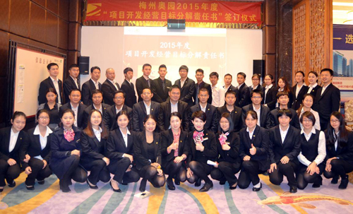 (2015年3月16日——梅州)3月16日,梅州项目“2015年度项目开发经营目标分解责任书”签订仪式在销售中心隆重举行。梅州项目常务副总经理叶华四、副总经理杨韶雄及全体员工出席了本次签订仪式。