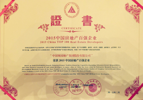 “2015中国房地产百强企业——运营效率TOP10”荣誉证书