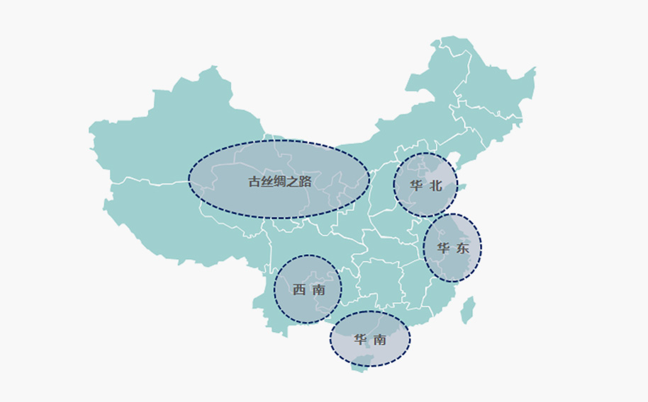 以华南、华东、华北、西南及围绕古丝绸之路为核心圈布局,未来将向海外拓展。